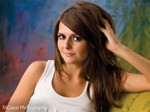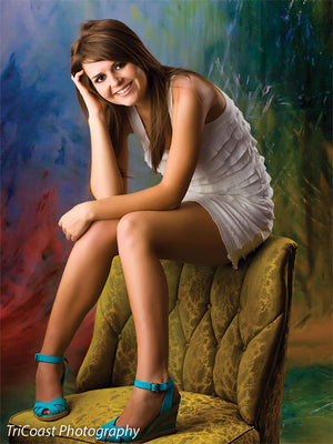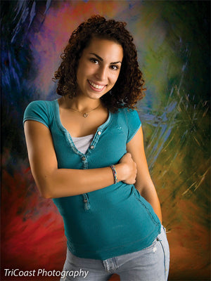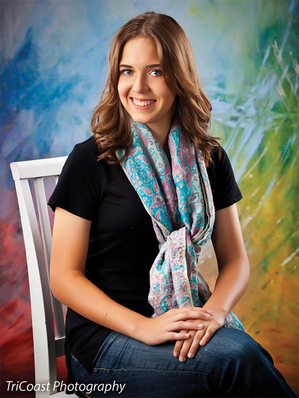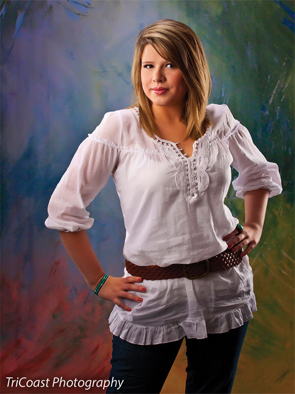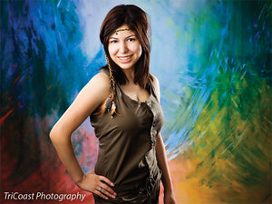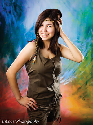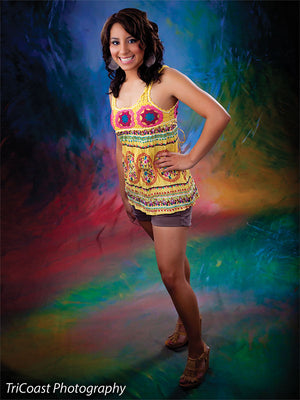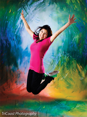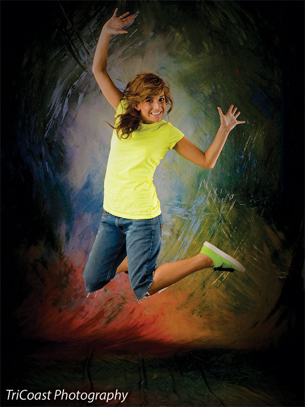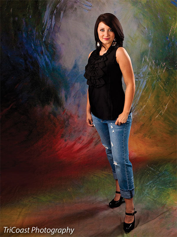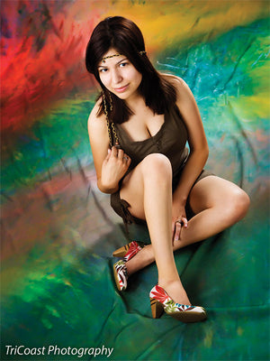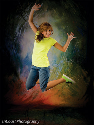 The Laelia Trail Photography Backdrop brings bold motion and rich saturation to your creative sessions. Swirling brushstrokes in red, green, yellow, and deep blue converge toward a luminous white center, creating a tunnel-like effect that draws focus to your subject. Ideal for vibrant portraits and stylized editorial work, this backdrop delivers dramatic flair and layered visual interest.