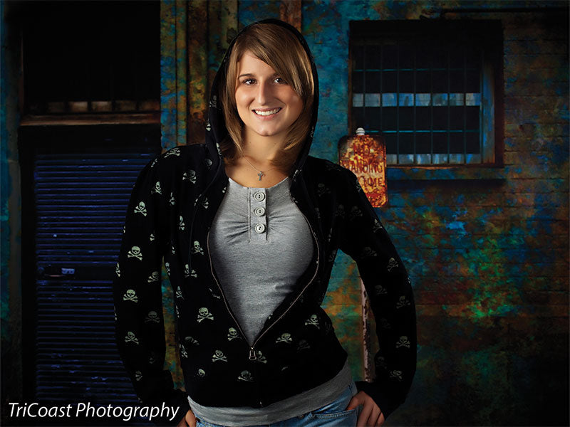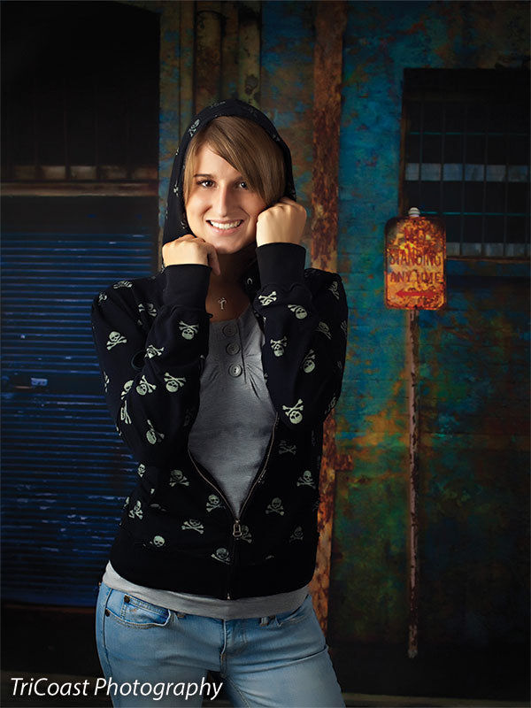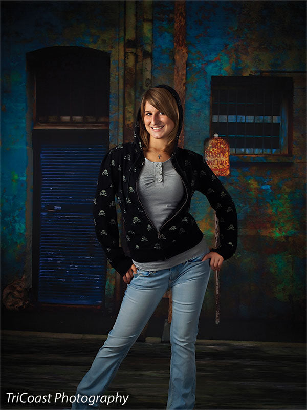 Infuse your studio with authentic street-style grit using the Garage Photography Backdrop. Featuring a weathered blue brick wall, rust-streaked piping, and a rugged metal garage door, this backdrop evokes the raw energy of an urban alleyway. Its richly layered textures and distressed patina provide an edgy, industrial aesthetic that adds instant depth and realism to any shoot.