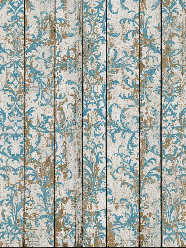 • General Description: Distressed blue and brown wood plank backdrop with vintage scroll accents.