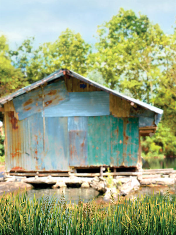 The Rustic River Shack Photography Backdrop offers a charming glimpse of rural life with an old, weathered shack standing by the riverbank. The backdrop captures the rustic textures of aged metal panels on the shack, with earthy tones of teal, brown, and rust. The peaceful river scene surrounded by greenery and wild grass adds to the overall serene and natural atmosphere, making this the perfect backdrop for country-themed photoshoots. The soft focus of the background enhances the depth and realism of the image, ensuring it brings an authentic touch to any shoot.