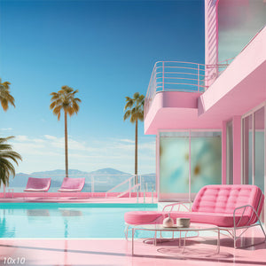 Transform your photoshoots with the vibrant and stylish Barbie's Chic Pink Poolside Photography Backdrop. This stunning backdrop features a luxurious pink poolside scene complete with modern architecture, palm trees, and chic outdoor furniture. Ideal for creating a glamorous and playful atmosphere, this backdrop is perfect for children's photoshoots, Barbie-themed parties, fashion shoots, and any event that requires a touch of elegance and fun.