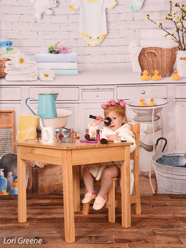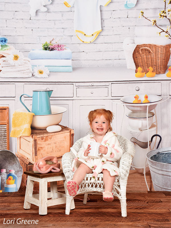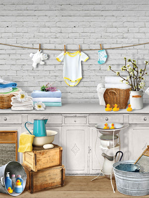 The Rustic Baby Laundry Room Photography Backdrop provides a warm and nostalgic atmosphere for newborn, baby, and toddler photoshoots. With a vintage-style laundry room featuring a clothesline, wooden crates, folded towels, and baby rubber ducks, this backdrop is perfect for capturing precious moments during milestone sessions, baby announcements, or themed baby portraits.
