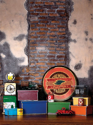 The Vintage Garage Toy Display Photography Backdrop features a weathered brick wall, complemented by vintage toys, metal signs, and rustic oil cans. This backdrop is perfect for creating an industrial, nostalgic feel in your photoshoots. Whether you're shooting portraits, products, or automotive-themed sessions, this backdrop offers a dynamic and visually textured setting.