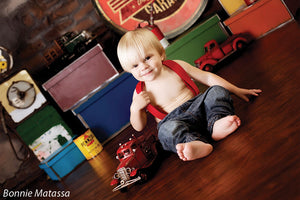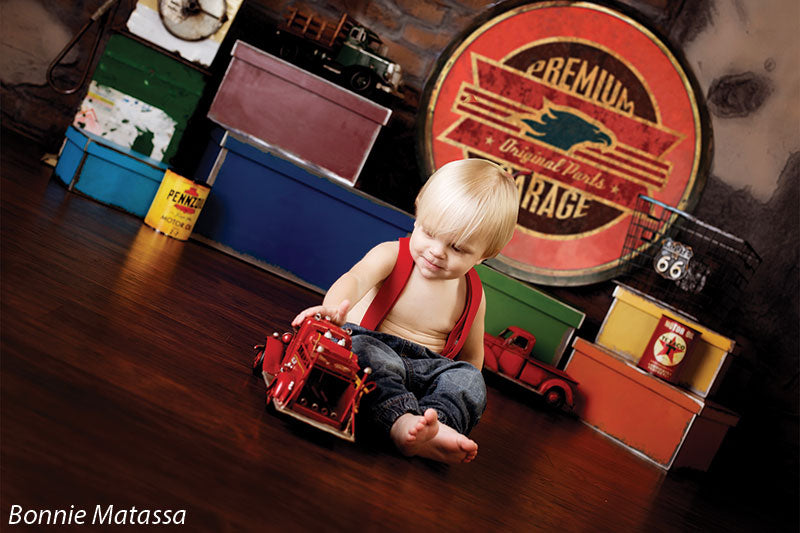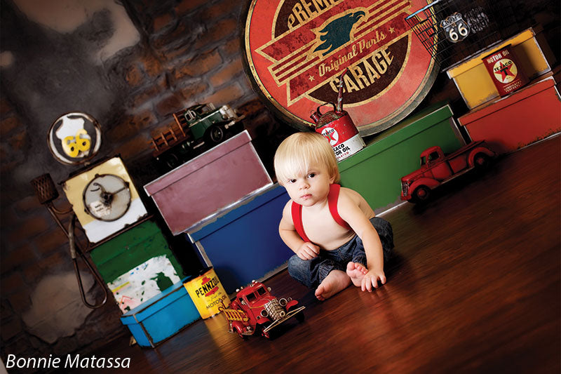 The backdrop captures a rugged scene with retro toys and signs, adding layers of history and charm to your photography. From the vibrant reds, blues, and greens of the toy trucks to the deep earth tones of the brick wall, every detail is carefully crafted to enhance your shots. It's a great choice for both retro-inspired and industrial-themed photography.