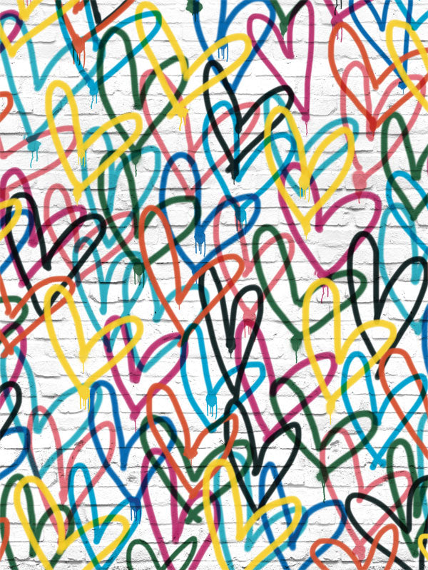 • General Description: A white brick wall covered in vibrant graffiti hearts, offering a lively, energetic background for any photoshoot.