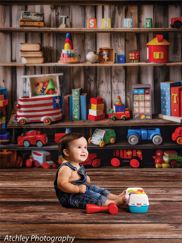 Create timeless memories with our Kids Cake Smash Rustic Wooden Toy Photography Backdrop. This charming setup features an array of vintage-style wooden toys, including trucks, blocks, and trains, meticulously arranged on rustic wooden shelves. Perfect for cake smash sessions, birthday portraits, and playful themed photoshoots, this backdrop offers a warm, inviting atmosphere that evokes childhood memories. Available in various sizes and materials, including vinyl and fabric, it is easy to set up and clean, making it suitable for both indoor and outdoor sessions. Capture the joyful spirit of childhood with this charming wooden toy backdrop. Order now and make your cake smash sessions unforgettable!