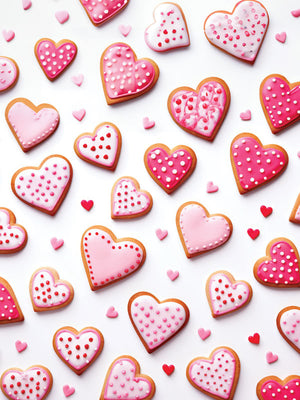 • Playful Design: Features heart-shaped cookies decorated with pink and red icing on a white background.