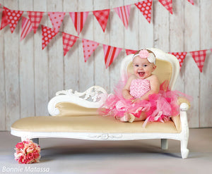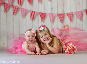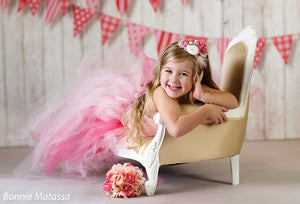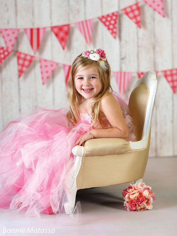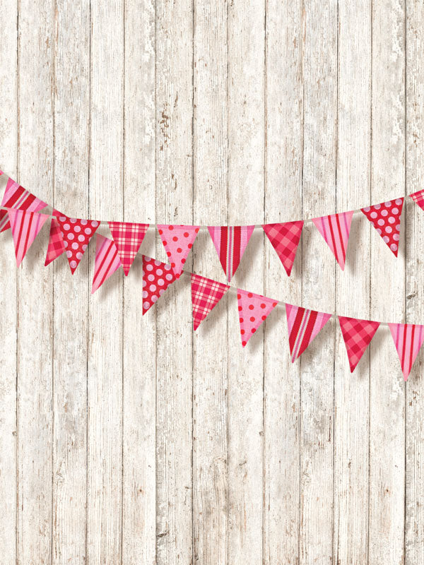The Pink Party Bunting and Wooden Wall Photography Backdrop offers a playful yet rustic charm that makes it a perfect backdrop for a variety of festive photoshoots. With a vibrant display of pink and red bunting in playful patterns—polka dots, stripes, and plaid—this backdrop adds a joyful touch to any photoshoot. The backdrop features a string of bunting hung across a whitewashed wooden plank wall, creating a warm and inviting aesthetic that evokes nostalgia and fun.