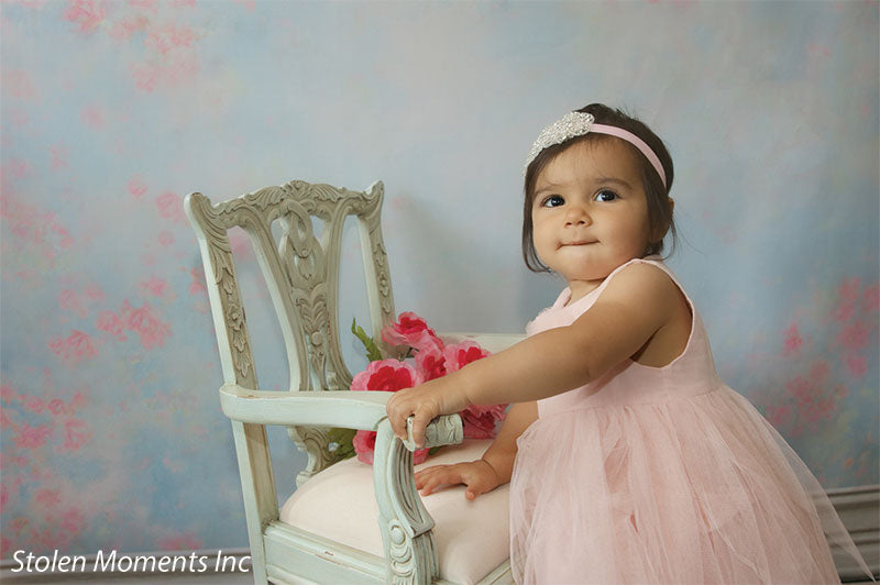 This floral backdrop combines the delicate colors of a springtime sky with subtle pink and rose accents, giving it an ethereal quality that makes it perfect for romantic portrait sessions. The soft color palette and organic floral pattern make it a versatile choice for a variety of photography genres, from portraiture to spring-themed shoots and editorial work. The romantic pastel floral background provides a high-quality, professional-grade look that enhances the subject without overwhelming the composition.