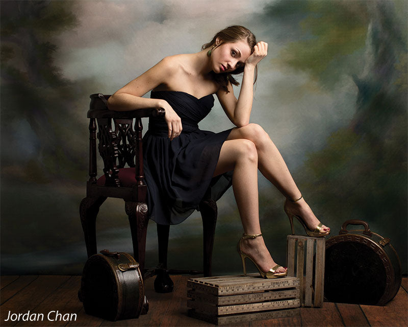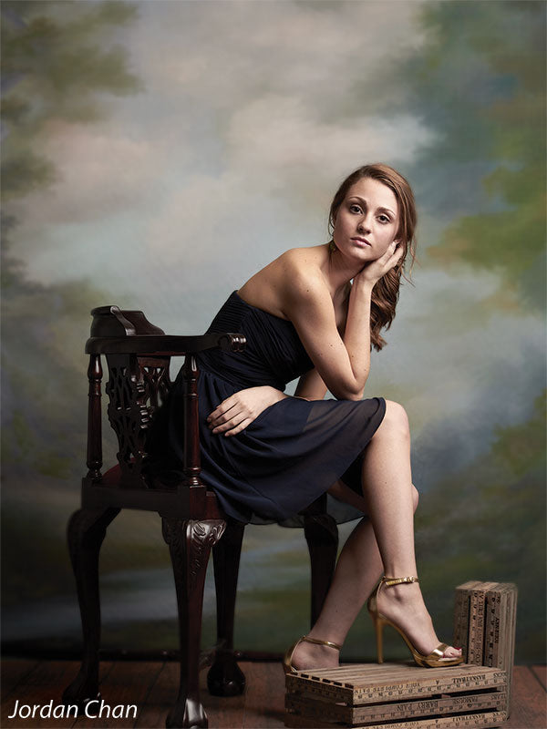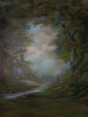 The Scenic Spring Photography Backdrop offers a romantic, painterly forest scene with gently curved trees, a winding stream, and a soft pastel sky. The composition draws the viewer through a dreamy glade bathed in light and shadow, evoking a timeless, storybook mood. Ideal for portraits that call for natural serenity and classical beauty, this backdrop creates immersive depth without distraction—perfect for capturing quiet emotion and fine detail.