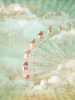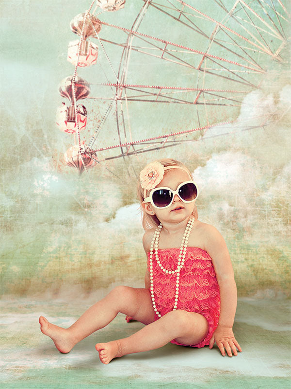 Transport your photography subjects to a whimsical carnival with the Vintage Ferris Wheel Photography Backdrop. This backdrop features a beautifully detailed Ferris wheel set against a dreamy, pastel sky, evoking the nostalgia and magic of a vintage carnival scene. The soft, faded colors and textured clouds create a surreal, almost ethereal atmosphere, perfect for adding a unique touch to any photoshoot.