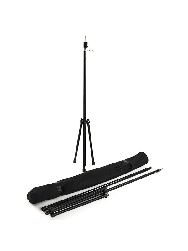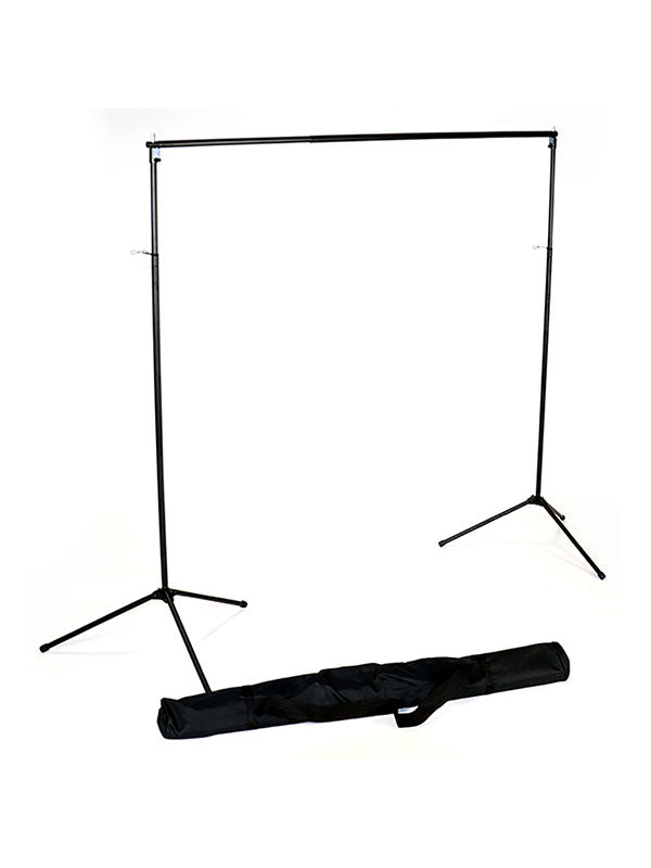 Economy backdrop stand kit includes two stands with collapsible legs, 1 crossbar, and a carrying case. Easily supports small canvas backdrops, muslin backdrops, and small paper backdrops. Legs collapse down for easy storage.