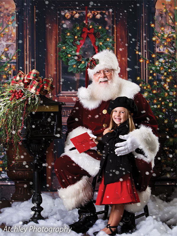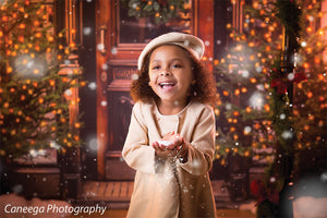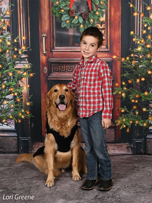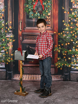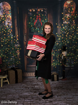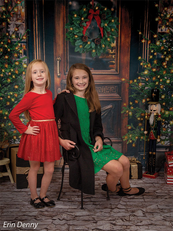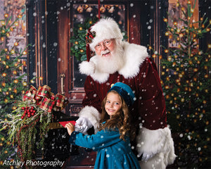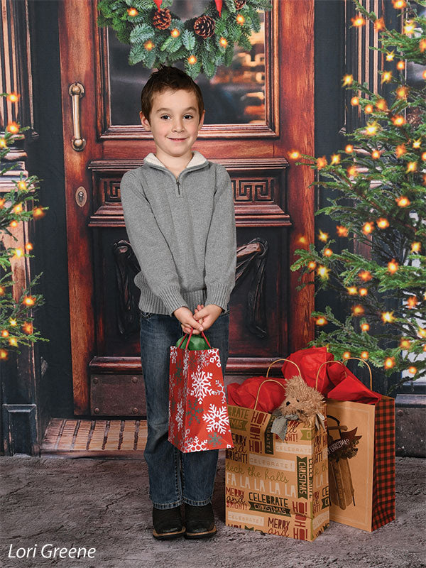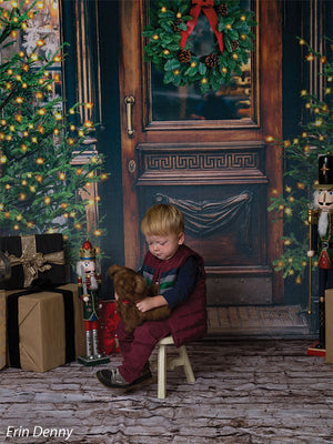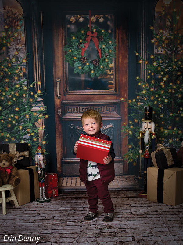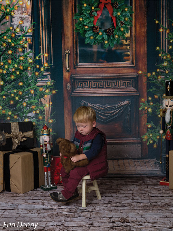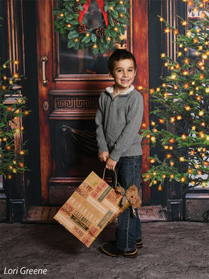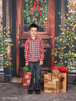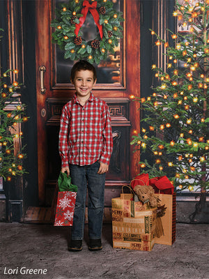 The intricate design of the wooden door, the lush greenery of the wreath and trees, and the twinkling lights are all captured in stunning detail, ensuring a beautiful and realistic backdrop for your photoshoots. Whether you're shooting in a professional studio or on location, this backdrop is sure to add a festive touch to your holiday images.
