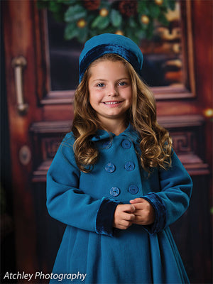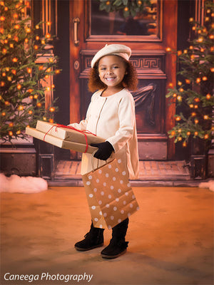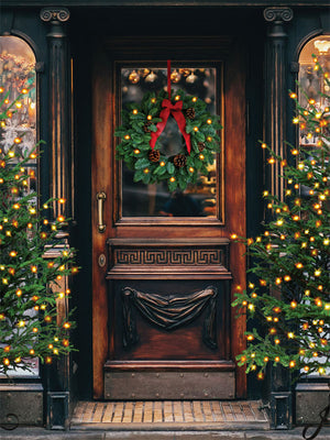 Bring timeless charm to your holiday photoshoots with the *Vintage Holiday Doorway Photography Backdrop*. This backdrop features a beautifully detailed wooden door decorated with a festive wreath, flanked by two Christmas trees wrapped in glowing holiday lights. The scene evokes a warm and inviting atmosphere, perfect for capturing memorable Christmas portraits, family holiday photos, or cozy vintage-themed photography sessions.