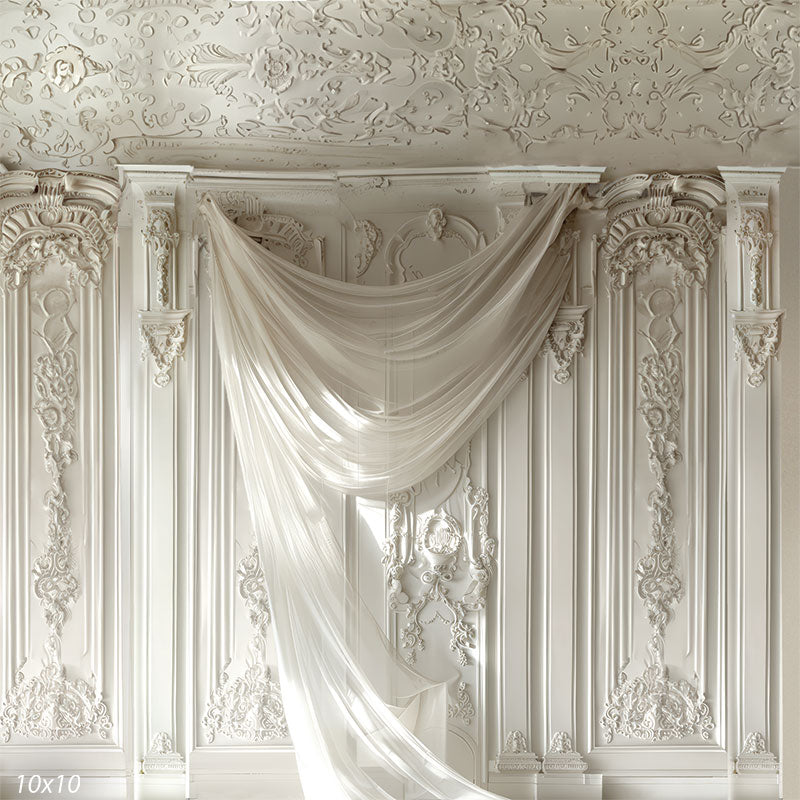 Capture the essence of classical beauty with this ornate white panel backdrop, enhanced by a flowing sheer fabric, perfect for creating elegant and timeless photos.