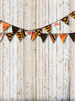 The Halloween Bunting with Wooden Background Photography Backdrop is a charming and rustic backdrop perfect for Halloween-themed photoshoots. The backdrop features a natural, distressed white wooden panel background adorned with a festive Halloween bunting. The bunting showcases a variety of patterns, including pumpkins, bats, stripes, and skulls, all in classic Halloween colors like orange, black, and white. This backdrop creates a delightful seasonal setting, making it ideal for capturing the spirit of Halloween in a friendly and creative manner.