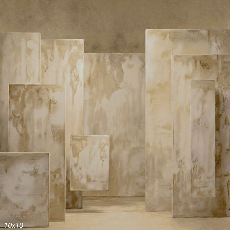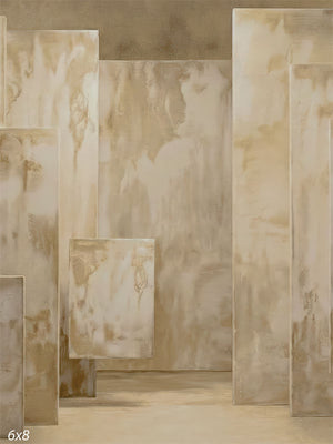 This photography backdrop presents a layered arrangement of tall rectangular panels finished in warm beige and ivory plaster textures, forming a structured studio background with depth and open negative space. The scene includes staggered vertical slabs at varying distances, with a continuous textured wall and floor that read as a single environment. Soft tonal variation and matte surface detail keep a person in frame visually dominant while the architectural planes add controlled dimensional interest.