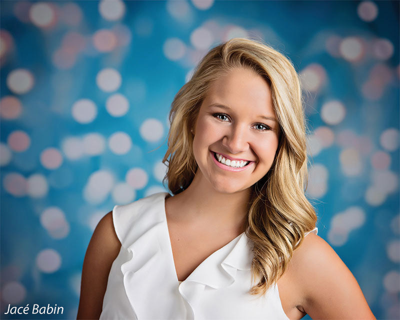 The backdrop is awash with a variety of warm-toned lights—soft white, pale gold, and gentle amber—against a cool, serene blue background. This gentle contrast between the warm light orbs and the soothing blue makes it a versatile choice for various photography styles. It works particularly well for portraits, engagement sessions, holiday-themed shoots, or editorial fashion photography. Whether you're capturing intimate moments or crafting an ethereal, dreamlike atmosphere, this bokeh backdrop offers an elegant and polished aesthetic to elevate your images.
