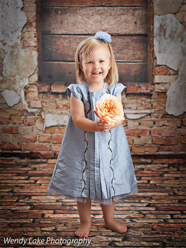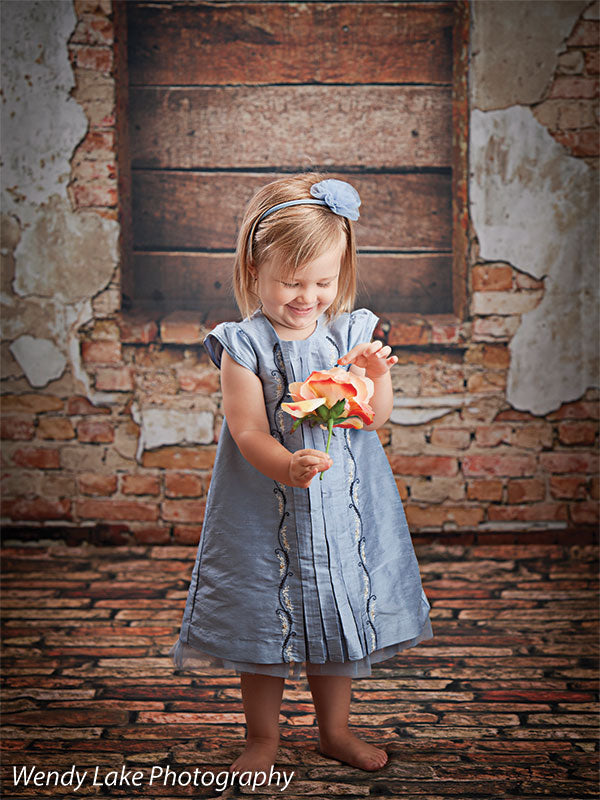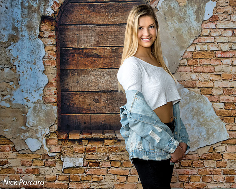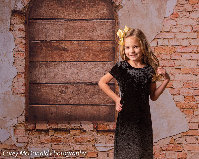 The high-resolution design captures every detail of the rustic brickwork, aged wooden planks, and peeling plaster. The combination of textures and tones makes this backdrop versatile enough for various photography styles, including urban, vintage, and industrial shoots.