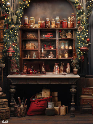 Step into a charming, rustic Christmas scene with this meticulously designed photography backdrop. The image captures a cozy, vintage-inspired holiday setup, perfect for creating warm and nostalgic holiday memories. The backdrop features a beautifully decorated wooden shelf, adorned with various holiday elements. On the shelves, there are glass jars filled with festive treats, miniature trees, candles, and a red toy car, adding a touch of whimsy to the scene.