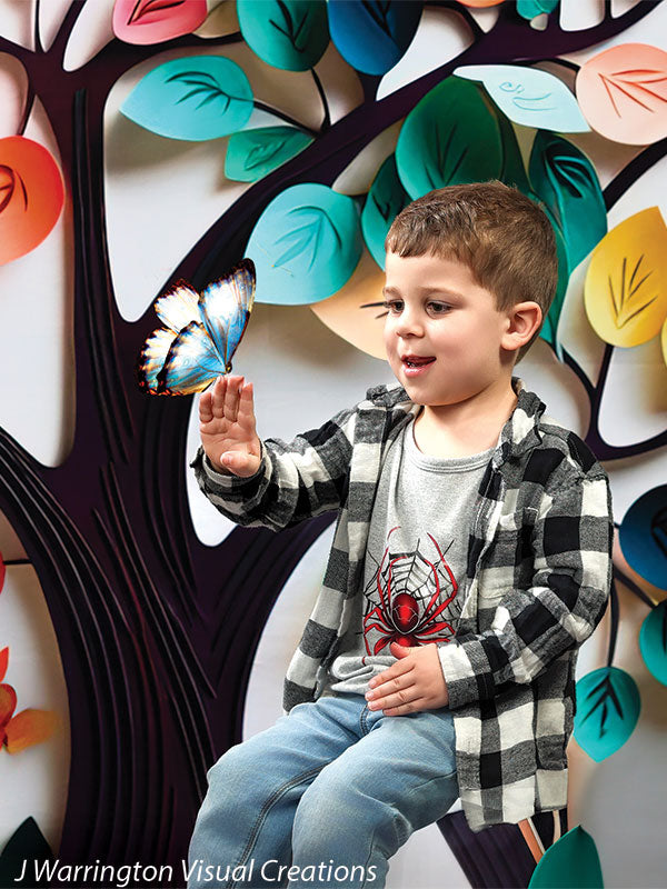 Turn your little one's cake smash into a colorful adventure with our Colorful Butterfly Tree Cake Smash Backdrop. Let your child shine amidst the vibrant leaves and playful butterflies of this enchanting scene.
