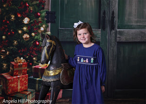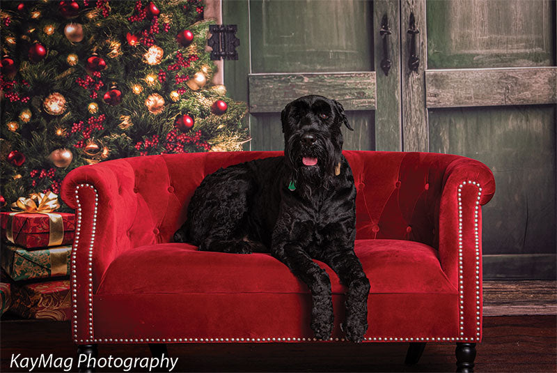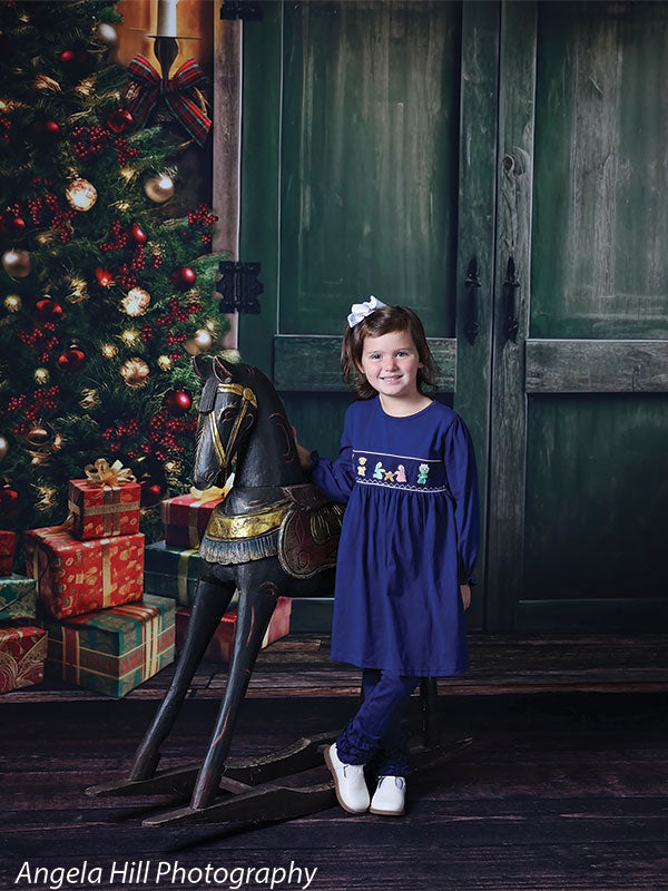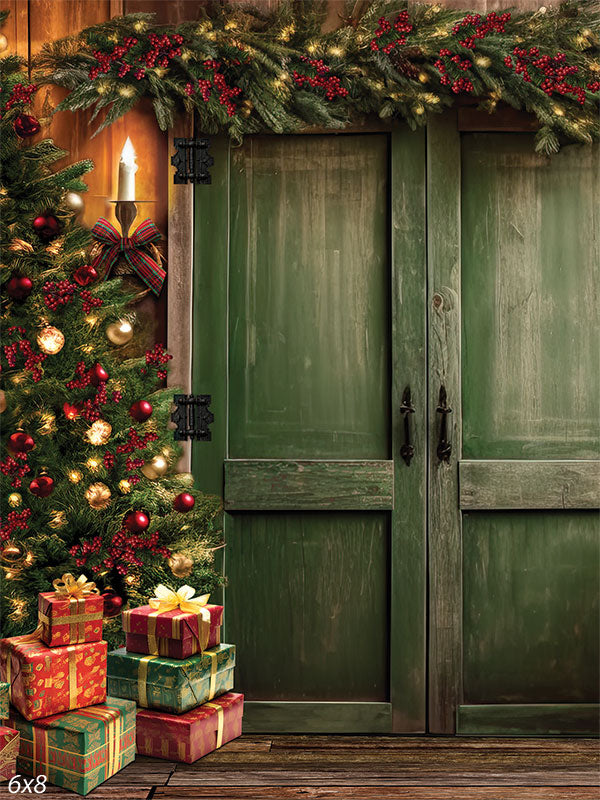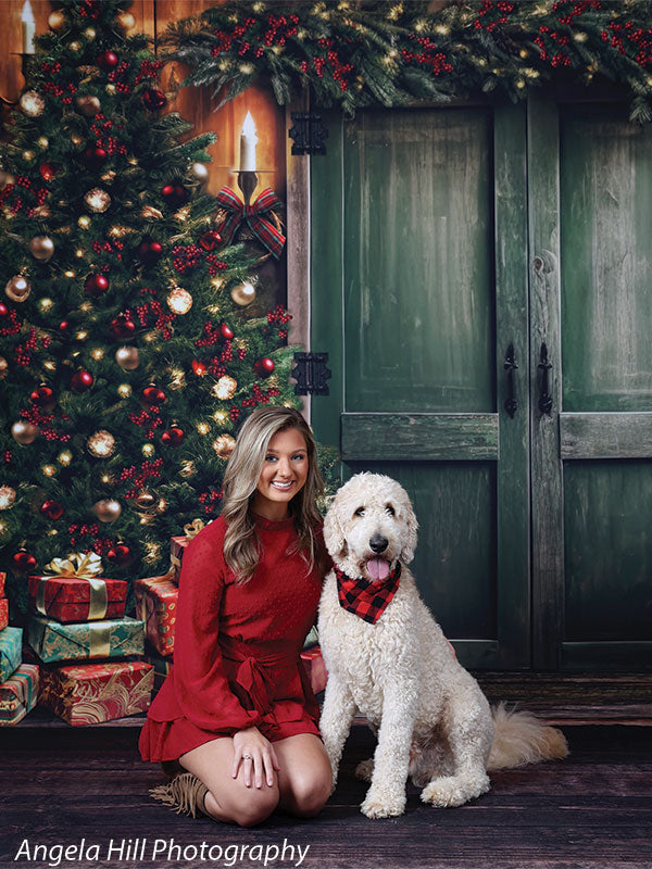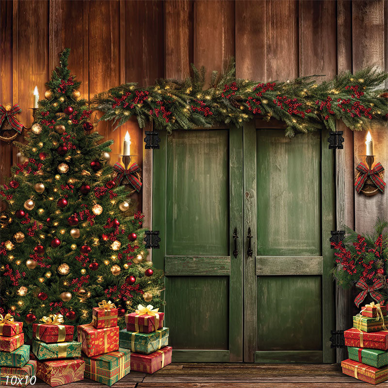 Capture the warmth and charm of the holiday season with the Rustic Christmas Barn Door Photography Backdrop. This backdrop features a beautifully decorated Christmas tree adorned with red and gold ornaments, festive garlands, and an inviting green barn door surrounded by neatly wrapped presents. The rustic design evokes a cozy, nostalgic feeling, making it perfect for a variety of holiday-themed photoshoots.