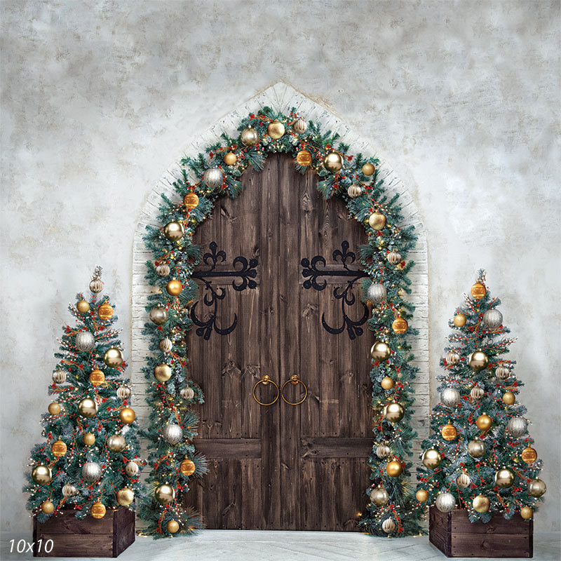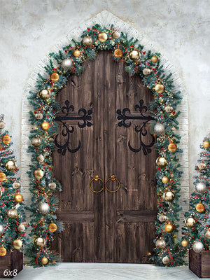 The Rustic Holiday Doorway Photography Backdrop sets the scene for a charming and festive holiday setting. This backdrop features a beautifully adorned wooden door framed with lush green garlands decorated with golden and silver ornaments, creating a warm and inviting holiday atmosphere. The rustic wooden door, with its dark wood texture and intricate iron accents, provides a perfect contrast to the sparkling decorations, adding depth and interest to the scene. This backdrop is ideal for holiday-themed photoshoots, family portraits, and Christmas card sessions, bringing a touch of traditional holiday charm to your photography.