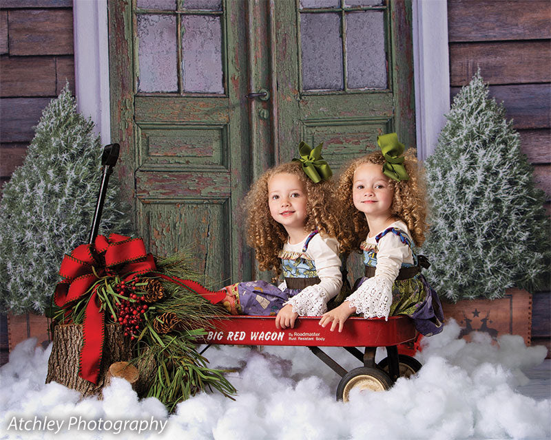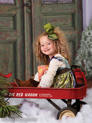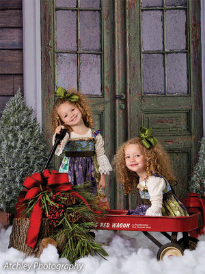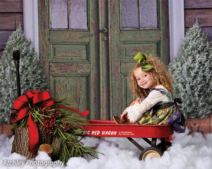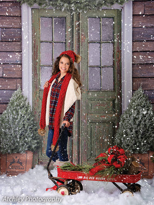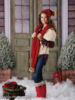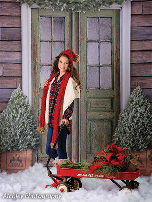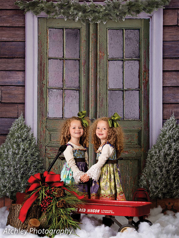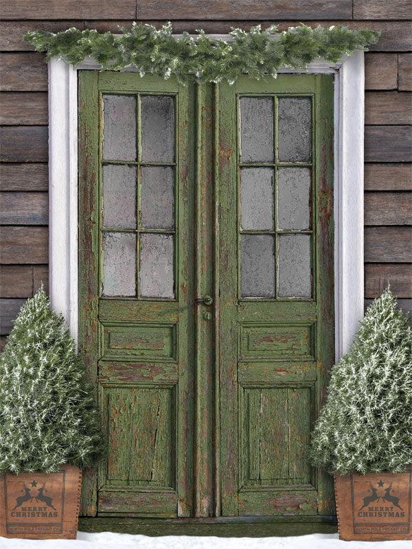 The Rustic Christmas Door Photography Backdrop offers a charming, vintage holiday scene featuring a beautifully weathered green double door surrounded by frosted Christmas trees and adorned with an evergreen garland. This rustic setting provides a perfect backdrop for holiday-themed photoshoots, whether you’re capturing festive family portraits, Christmas card photos, or professional holiday portraits.