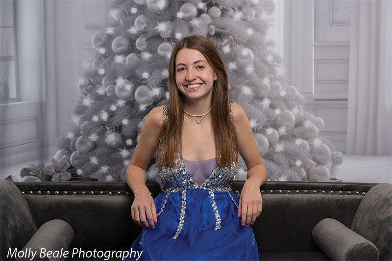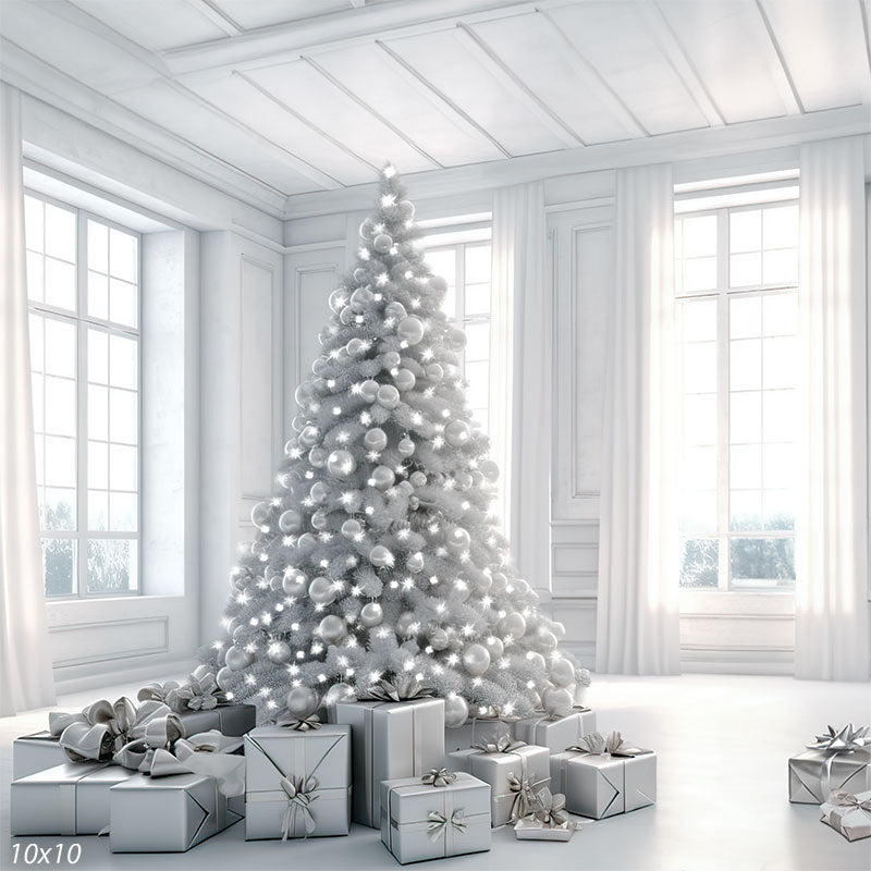 The Elegant White Christmas Tree Photography Backdrop is designed to capture the serene and sophisticated essence of a winter wonderland. This backdrop showcases a beautifully adorned white Christmas tree with matching white and silver ornaments, surrounded by elegantly wrapped gifts in a pristine white room. This backdrop is perfect for creating a luxurious, serene, and festive atmosphere in holiday photoshoots.