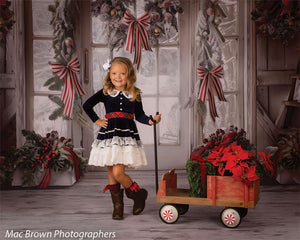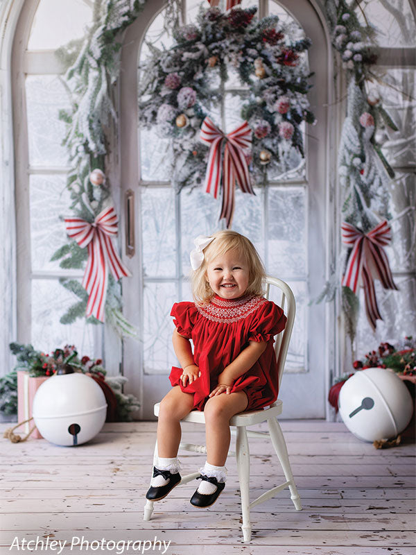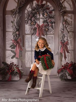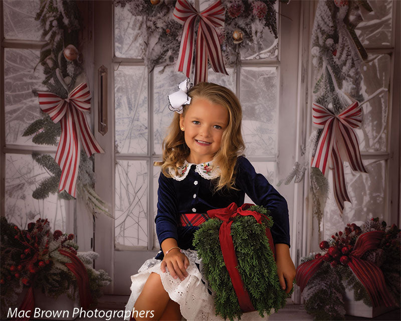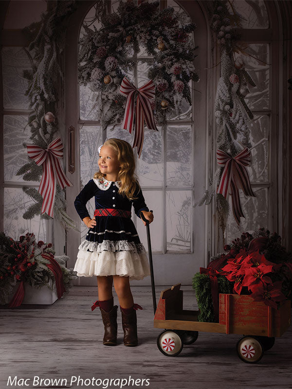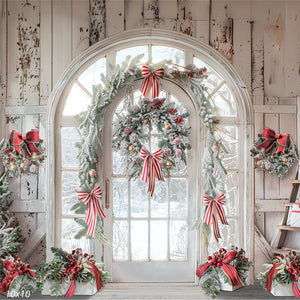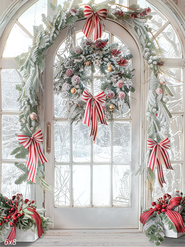 Create a winter wonderland in your studio with our Christmas Peppermint Door Photography Backdrop. This stunning backdrop features a beautifully frosted arched door adorned with lush, snow-dusted garlands, festive wreaths, and vibrant red and white striped bows. The serene snowy landscape visible through the frosted windows adds a magical touch, perfect for capturing the holiday spirit.