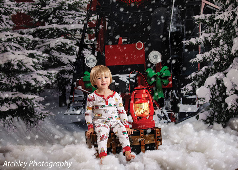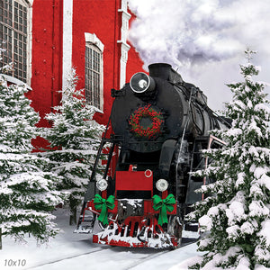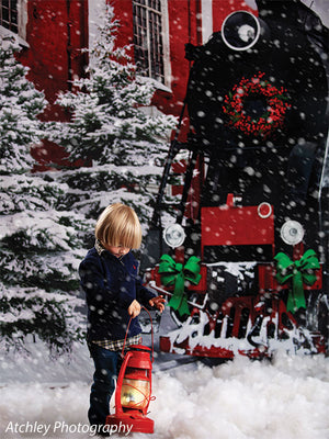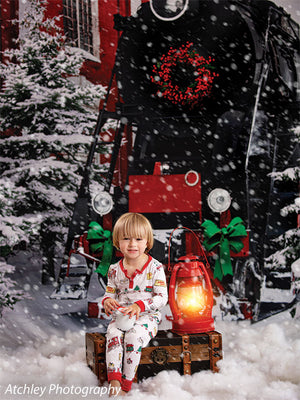 The Holiday Express Train Photography Backdrop is a charming and nostalgic setting designed to bring the joy and wonder of the holiday season to life. The centerpiece of this backdrop is a classic steam locomotive, beautifully decorated with a festive wreath on the front, green bows on the headlights, and a light dusting of snow on the body. The train's vintage design and detailed decorations evoke a sense of timeless holiday spirit, reminiscent of beloved Christmas tales and the magic of winter travel.