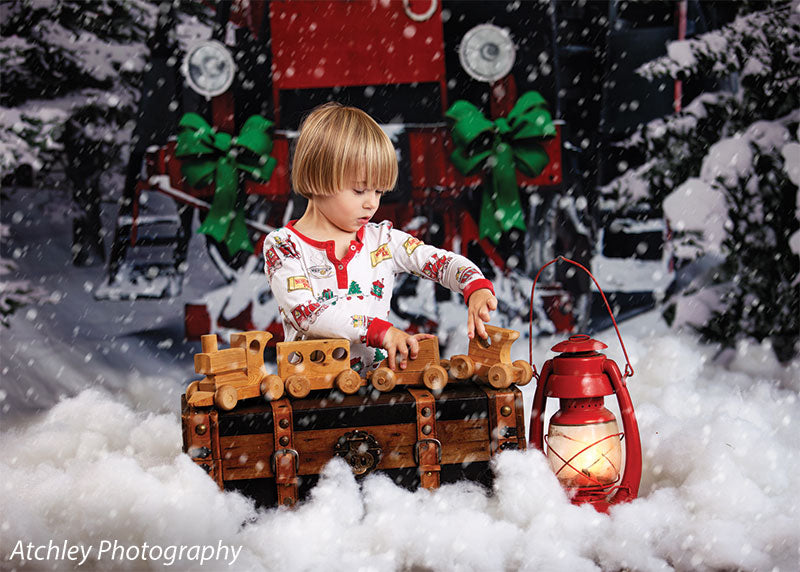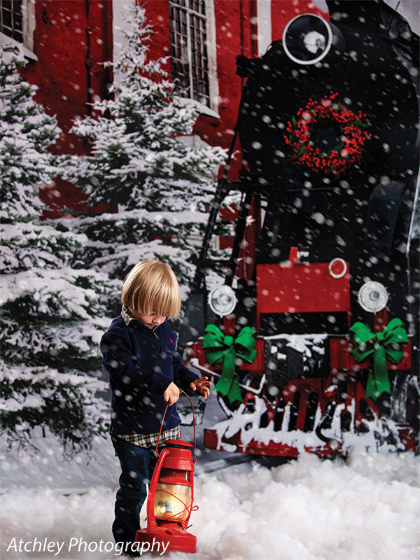 Surrounding the train are snow-covered pine trees that add to the backdrop’s wintry charm, enhancing the feeling of a cozy and inviting holiday setting. The background features a quaint red building, covered in snow, which adds a pop of color and a cozy touch to the scene. The combination of the train, the snow-laden trees, and the festive decorations creates a whimsical and enchanting atmosphere that’s perfect for capturing memorable holiday moments.