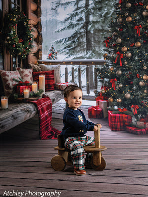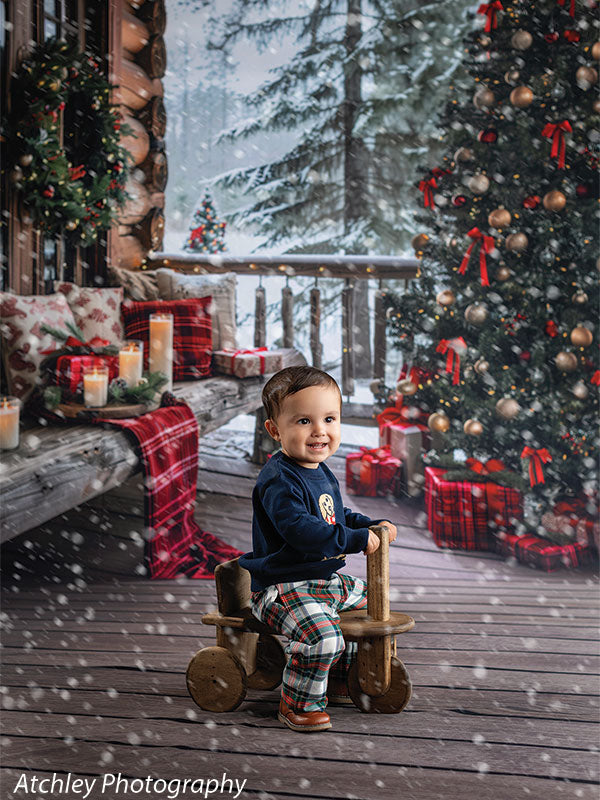 Immerse your studio in the warmth and charm of the holidays with the Cozy Log Cabin Christmas Tree Printed Photography Backdrop. This inviting scene features a rustic wooden porch adorned with glowing candles, plaid-wrapped gifts, evergreen wreaths, and a fully decorated Christmas tree set against a peaceful snow-covered forest. Ideal for capturing heartfelt holiday moments, this backdrop offers an atmosphere that feels both luxurious and homey.