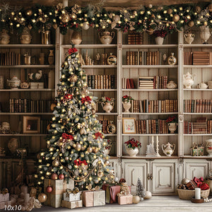 Introduce a touch of sophistication and storybook wonder to your holiday sessions with the Elegant Christmas Tree in Vintage Library Printed Photography Backdrop. Featuring a beautifully lit Christmas tree adorned with gold, champagne, and red ornaments set against antique bookcases and festive florals, this backdrop offers a warm and timeless environment perfect for upscale seasonal portraits.