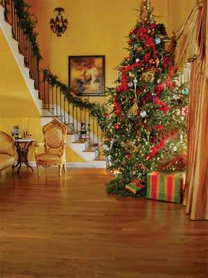 The Elegant Holiday Photography Backdrop captures the magic of a classic, upscale Christmas interior. Featuring a grand staircase, golden accents, and a lavishly decorated Christmas tree glowing with lights, ornaments, and red ribbon, this backdrop evokes warmth, luxury, and holiday nostalgia. It’s ideal for studio sessions looking to recreate a refined and inviting holiday home atmosphere.