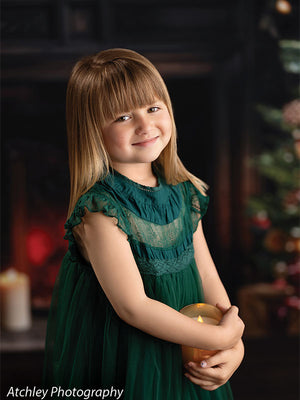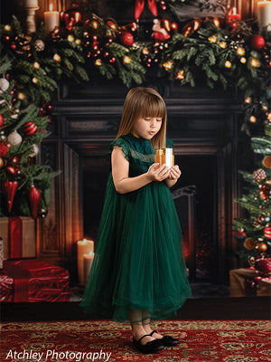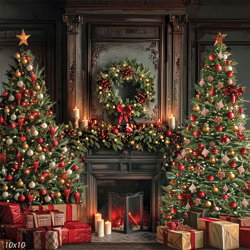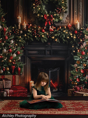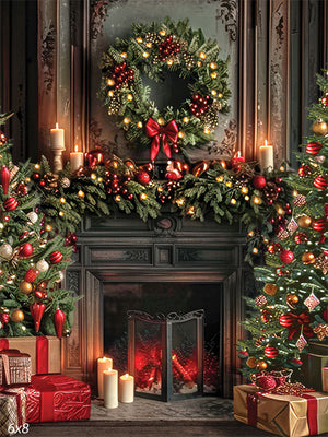 The Holiday Hearth & Tree Christmas Backdrop sets a classic seasonal tone with a beautifully decorated fireplace framed by lush garland, glowing candles, and a red bow wreath. Two elegant Christmas trees adorned with red, gold, and white ornaments add symmetry and warmth, while wrapped gifts complete the holiday setting. Designed for photographers looking to create cozy, traditional Christmas portraits, this backdrop brings the festive charm of a timeless indoor scene straight into the studio.