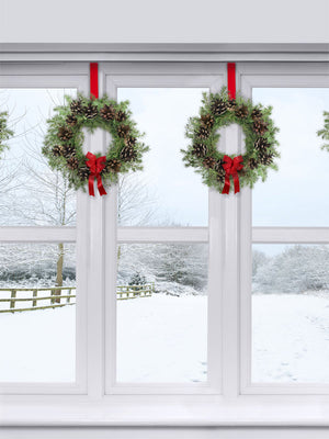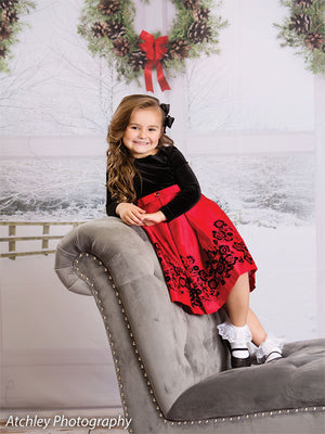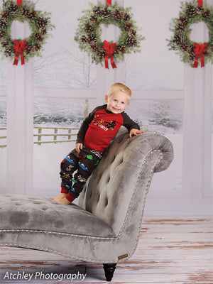 The Christmas Wreath Window Winter Scene Photography Backdrop captures the serene beauty of a snow-covered winter landscape as seen through a festive window. The classic white window is adorned with holiday wreaths featuring pinecones, red berries, and beautiful red bows, giving the entire scene a festive holiday feel. The snow-draped scenery outside the window enhances the peaceful, wintry atmosphere, creating a perfect setting for Christmas-themed photoshoots.