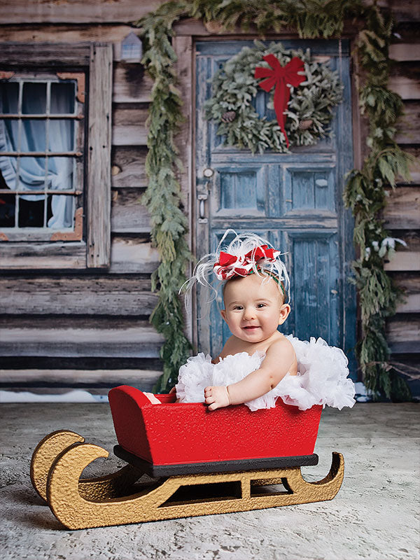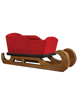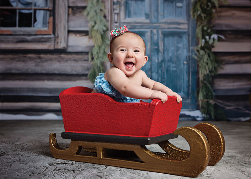 Newborn child's sled Christmas photography prop features red with gold accents. . This sled photo prop is made from a hard durable coated foam which makes this holiday portrait prop lightweight and easy to use.