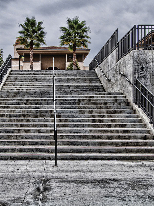 Elevate your photoshoots with our Concrete Steps Urban Photography Backdrop. This backdrop features a wide set of concrete stairs leading to a palm-tree-flanked building, perfect for creating a modern urban vibe. The worn steps and metal railings add an authentic touch, making it ideal for street-style and urban-themed photography. The overcast sky enhances the somber, city atmosphere.