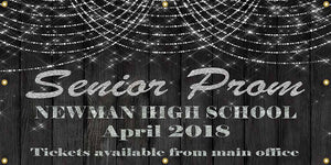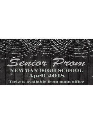 Prom banners are great for decorating the school halls prior to the big event. Custom prom banner showcases twinkle lights on a dark textured background and allows for plenty of room for personalization text. All banner sizes are stated width x height.