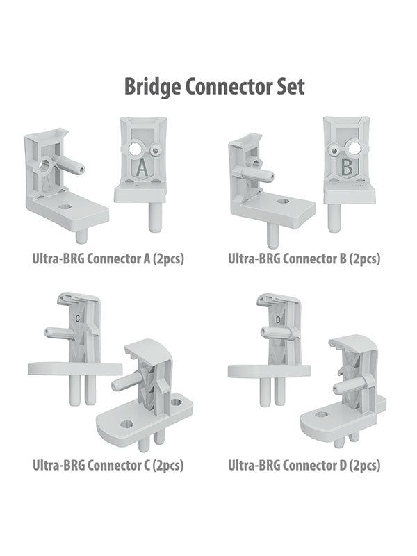 Bridge and T-connectors are used for larger connected backdrop frame setups where additional StudioEdge frames are tied into a more complex layout. These parts are used when building beyond a simple corner or straight run.