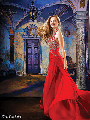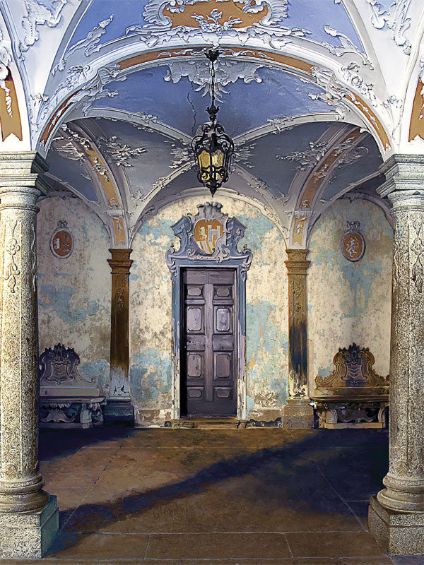 The Baroque Hallway with Ornate Columns and Vintage Door Photography Backdrop offers a grand, classical setting for any photoshoot. Featuring an intricately designed Baroque-style ceiling, vintage wooden door, and detailed columns, this backdrop exudes elegance and sophistication. Its muted gold and soft blue tones combined with weathered textures create a timeless, regal atmosphere that elevates any project.