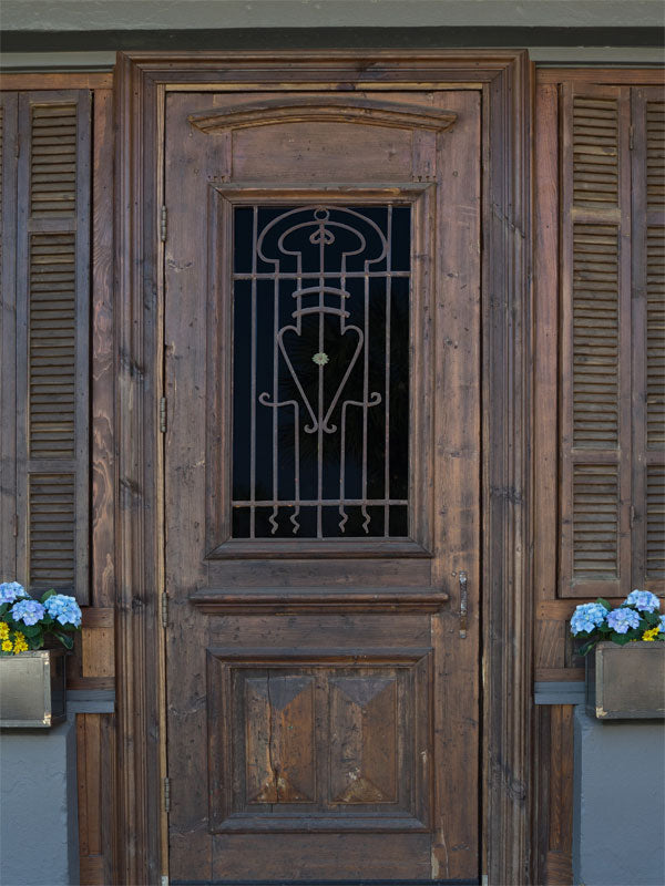The Rustic Wooden Door Photography Backdrop is the ideal setting for photographers seeking to create a charming, rustic atmosphere in their photoshoots. Featuring a beautifully weathered wooden door with intricate iron detailing on the glass window, this backdrop captures the essence of vintage countryside or European village charm. The door is framed by rustic wooden shutters and flower boxes, further enhancing its warm and welcoming appeal.