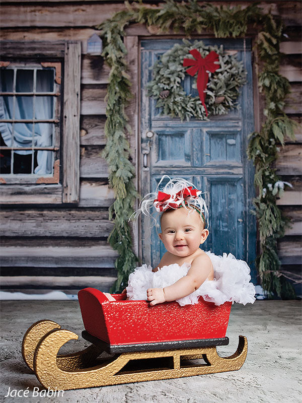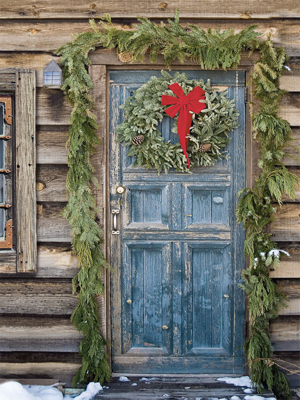 This stunning Rustic Winter Door with Evergreen Wreath photography backdrop perfectly captures the charm and warmth of a festive winter setting. The backdrop features a beautifully aged wooden door framed with lush evergreen garland and adorned with a full, round wreath at the center, topped with a striking red bow. The door's weathered blue paint adds a touch of rustic elegance, contrasting with the vibrant greenery, creating a cozy and inviting atmosphere. A light dusting of snow on the garland completes the festive charm, ideal for holiday-themed photoshoots.