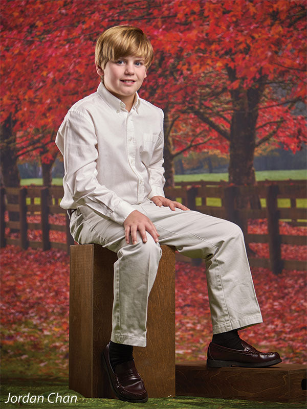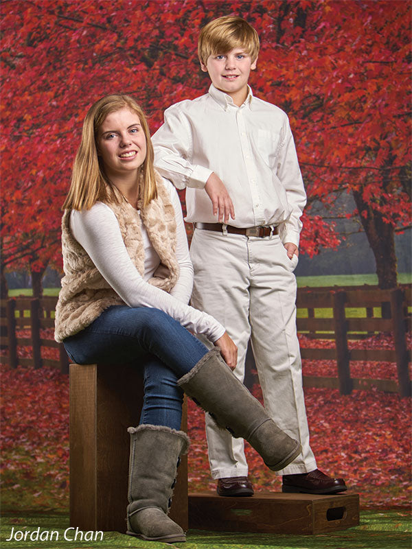 • General Description: A vibrant autumn scene featuring maple trees with rich red and orange leaves, framed by a rustic wooden fence. Perfect for creating fall-themed photoshoots with a natural and seasonal atmosphere.