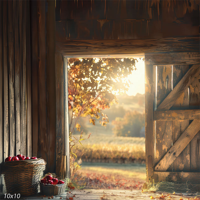 Capture the warmth and serenity of an early autumn morning with our stunning photography backdrop featuring a sunlit countryside view framed by a rustic wooden doorway. This beautifully crafted image is perfect for photographers aiming to evoke feelings of nostalgia, peace, and natural beauty in their photoshoots.