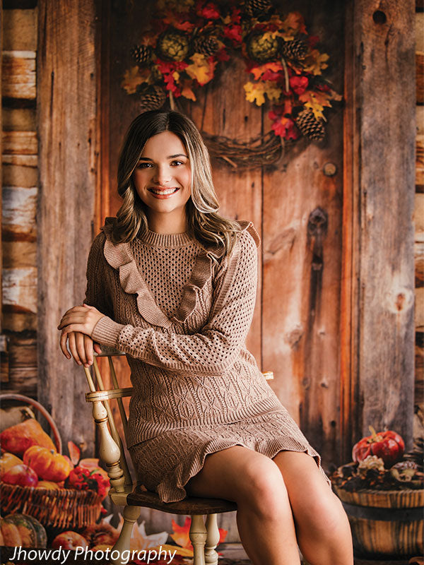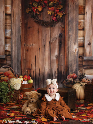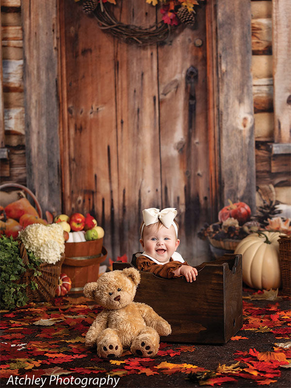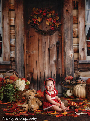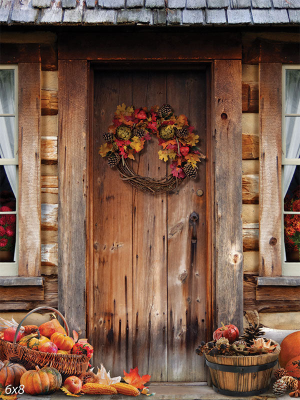 The Rustic Autumn Cabin Door Photography Backdrop features a heartwarming and inviting autumn scene, perfect for seasonal photoshoots. The focal point is a rustic wooden cabin door with rich, weathered textures that tell a story of countless seasons. The door is decorated with a vibrant wreath made of pinecones, colorful autumn leaves, and berries, adding a festive touch to the composition.