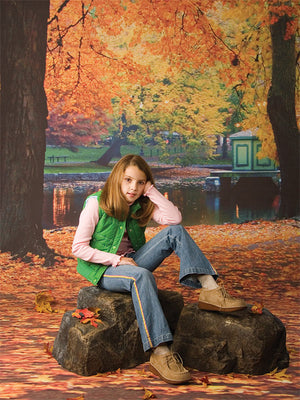 The Fall Creek Park Photography Backdrop captures the breathtaking richness of autumn with golden leaves, stately tree trunks, and a peaceful lakeside view. With vibrant orange foliage overhead and a soft carpet of fallen leaves below, this scene evokes warmth, nostalgia, and timeless outdoor beauty—perfect for seasonal photo sessions.