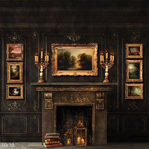 The Vintage Elegance Fireplace Photography Backdrop showcases a luxurious and classical setting, perfect for creating a warm and sophisticated atmosphere in your photos. This backdrop features an ornate fireplace, embellished with intricate carvings and gilded details. On top of the mantelpiece, a beautifully framed painting sits between two elegant candleholders, adding to the antique charm of the scene. The rich, dark tones of the backdrop, combined with the warm glow of the candles and the detailed decor elements, create an ambiance reminiscent of a grand Victorian parlor or a classic European library.