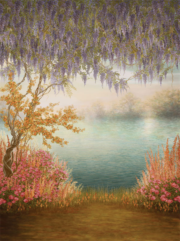 Capture the warmth and romance of autumn with the Fall Reflection Floral Lake Photography Backdrop. Featuring a hand-painted style scene with cascading wisteria, vibrant fall foliage, colorful floral borders, and a serene lake reflecting soft natural light, this backdrop creates a timeless, painterly setting perfect for portraits and fine art photography.